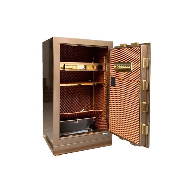 - Bên trong két được sơn tĩnh điện chống trầy xước và bao phủ vách ngăn và xung quanh thành két là một lớp da trần cao cấp và ốp gỗ sơn phủ bóng. Màu nâu tạo cảm giác sang trọng, sạch sẽ cho nội thất.