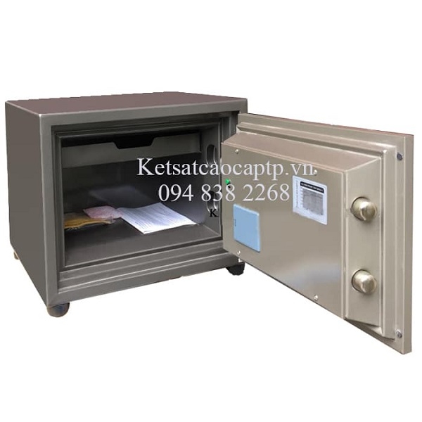 - Thân két sắt đúc đặc 02 lớp chống cháy chống phá, ở giữa là lớp bê tông xốp chống cháy đạt chuẩn.