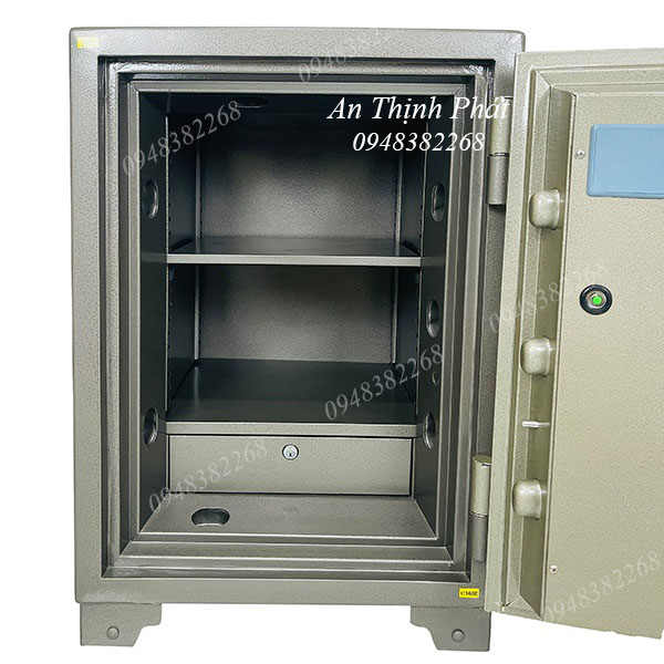 - Thân két sắt đúc đặc 02 lớp chống cháy chống phá, ở giữa là lớp bê tông xốp chống cháy đạt chuẩn.