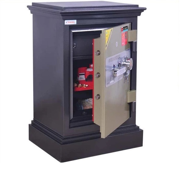 An toàn chống cháy, thân két đúc đặc 100%, hèm cửa dạng tam cấp giúp tăng khả năng chống cháy, chống phá. Két sắt có chốt to tự động ăn sâu vào lòng két.