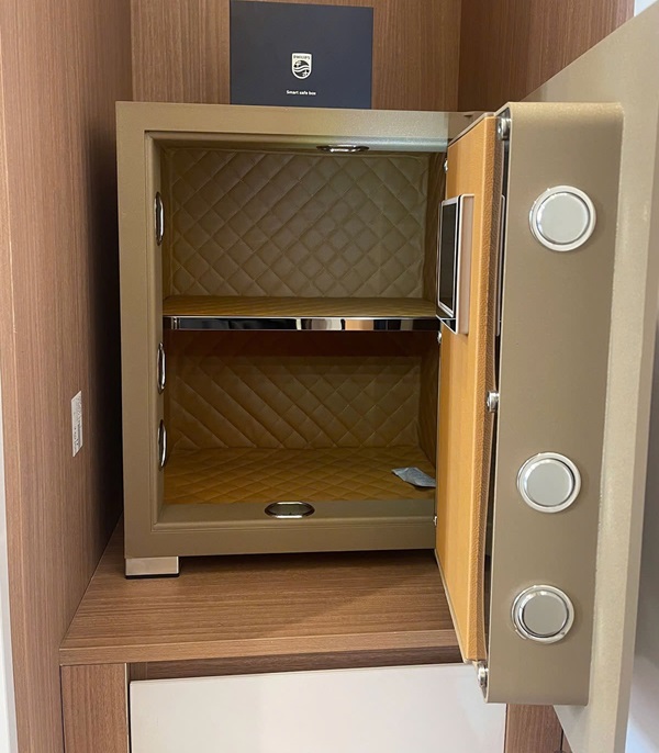 Hướng dẫn cách mở Két Sắt Philips: Thao tác bấm "# mật khẩu két sắt #" sau đó vặn núm xoay để mở két sắt.