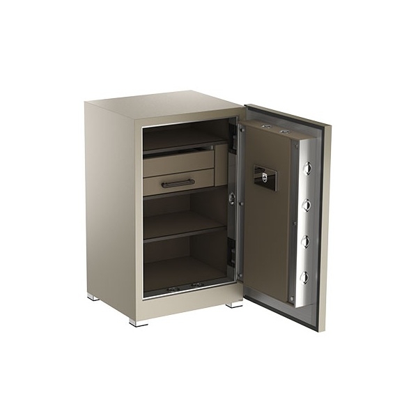 Hệ thống chốt khóa được chế tạo từ thép đặc nguyên khối với đường kính 32mm, bố trí theo cơ chế gia cường bốn phương, tạo nên lớp phòng vệ đa tầng chống lại các thủ đoạn xâm nhập bằng công cụ cạy phá hay thiết bị khoan cắt chuyên nghiệp. Khi kết hợp với thân két nguyên khối, kiến trúc khóa này hình thành một rào cản an ninh vững chắc, đảm bảo sự bảo vệ toàn vẹn và tối đa cho tài sản quý giá được cất giữ bên trong.