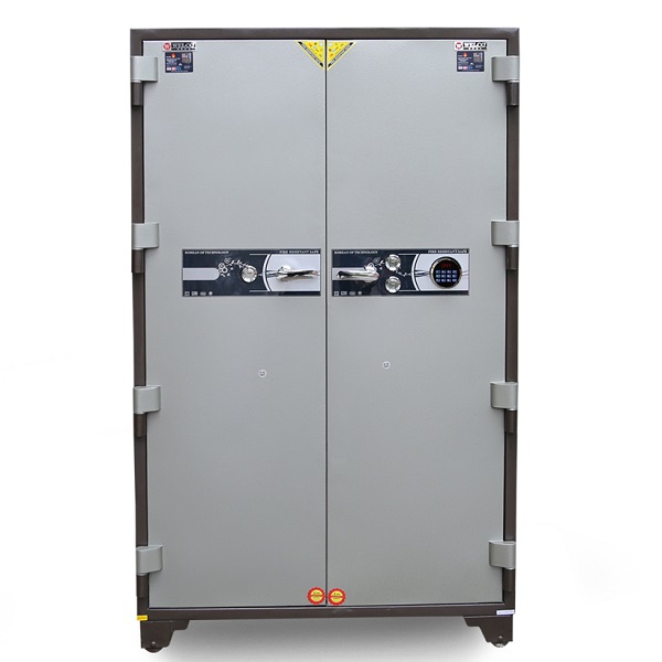 An toàn chống cháy, thân két đúc đặc 100%, hèm cửa dạng tam cấp giúp tăng khả năng chống cháy, chống phá. Két sắt có chốt to tự động ăn sâu vào lòng két.