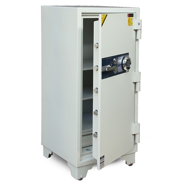 An toàn chống cháy, thân két đúc đặc 100%, hèm cửa dạng tam cấp giúp tăng khả năng chống cháy, chống phá. Két sắt có chốt to tự động ăn sâu vào lòng két.