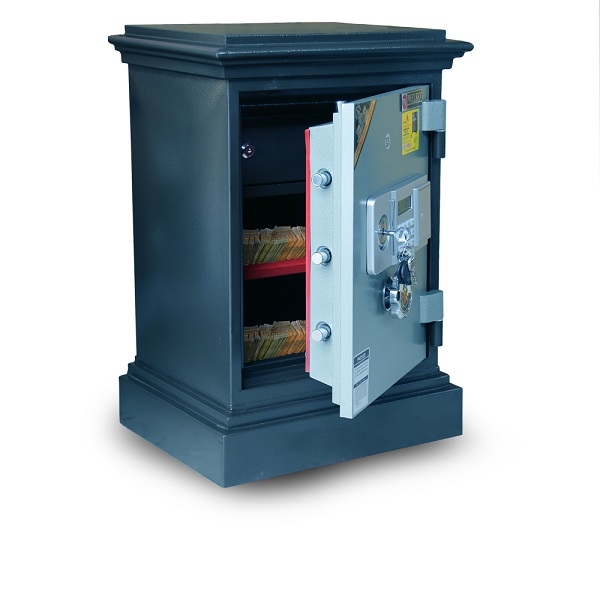 An toàn chống cháy, thân két đúc đặc 100%, hèm cửa dạng tam cấp giúp tăng khả năng chống cháy, chống phá. Két sắt có chốt to tự động ăn sâu vào lòng két.