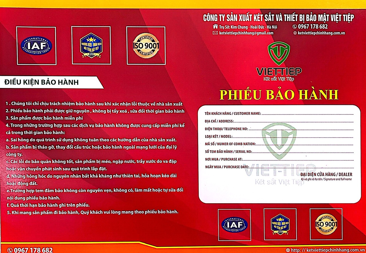 Két Sắt Việt Tiệp Chính Hãng Chúng tôi phân phối thì trên Phiếu bảo hành có đóng dấu của Nhà sản xuất. Cam kết sản phẩm bán ra là chính hãng 100%. Để đảm bảo quyền lợi của khách hàng về sau này thì khi mua hàng khách hàng phải điền đầy đủ thông tin vào phiếu và yêu cầu đơn vị phân phối ký xác nhận vào phiếu bảo hành này thì mới có giá trị.